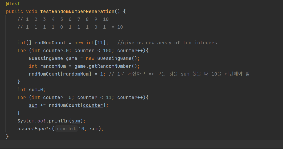 rndNumCount[randomNum] = 1; // 1로 저장하고 => 모든 것을 sum 했을 때 10을 리턴해야 함