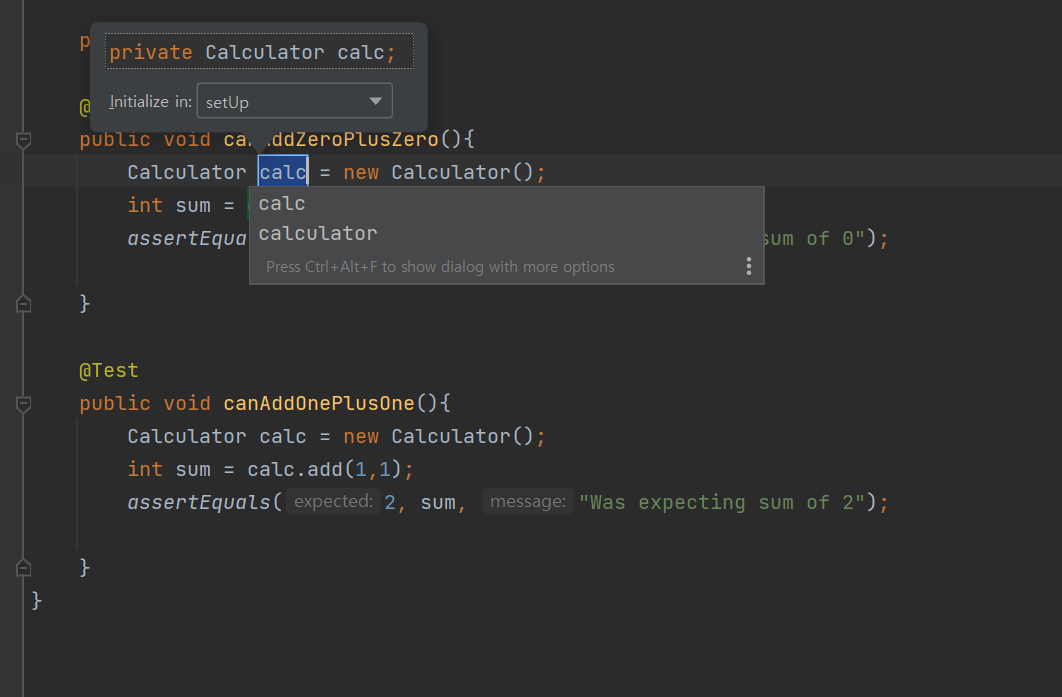 => 실제 테스트 메소드가 실행되기 전에 calc = new Calculator();가 먼저 실행되는 기능