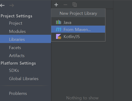 프로젝트 스트럭처에서 Library>+버튼>From Maven