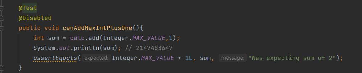 assertEquals(Integer.MAX_VALUE+1, sum, "Was expecting sum of 2");