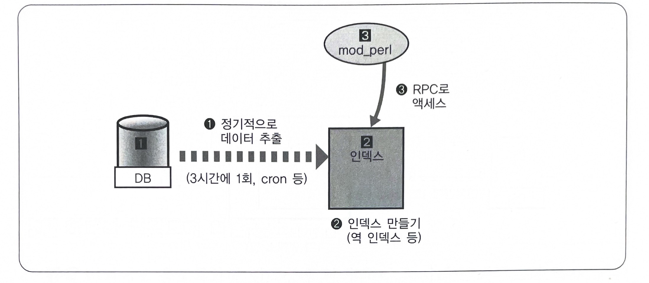배치 처리로 RDBMS에서 데이터를 추출해서 별도의 인덱스 서버와 같은 것을 만들고, 이 인덱스 서버에 웹 애플리케이션에서 RPC 등으로 액세스하는 방법을 사용한다.
