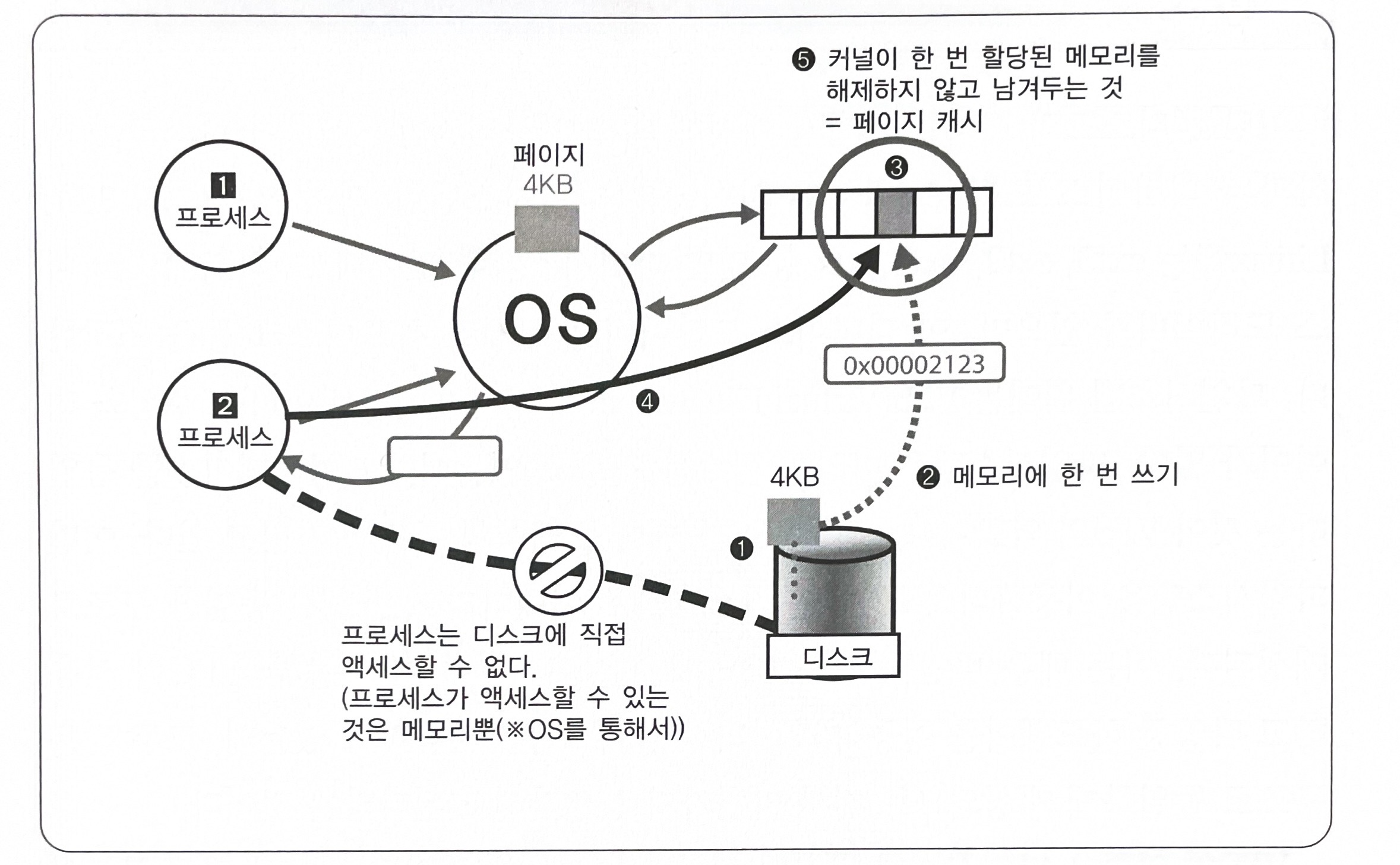 디스크와 메모리 간 속도차가 10^5~10^6배 이상 난다고 했는데, 원래 OS에는 디스크 내의 데이터에 빠르게 액세스할 수 있도록 하는 구조가 갖춰져 있다. OS는 메모리를 이용해서 디스크 액세스를 줄인다. 원리를 알고 이를 전제로 애플리케이션을 작성하면 OS에 상당부분을 맡길 수 있다.