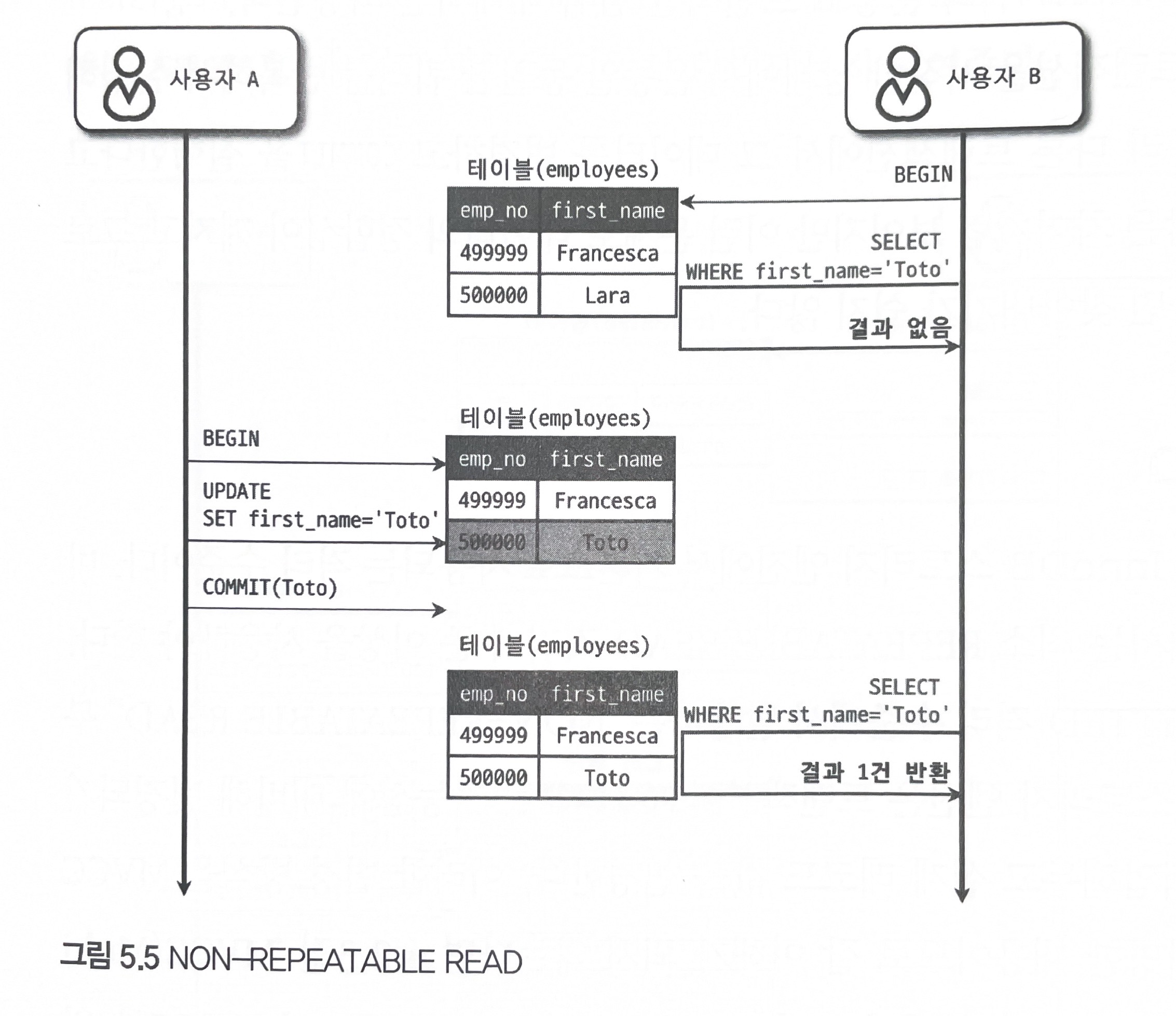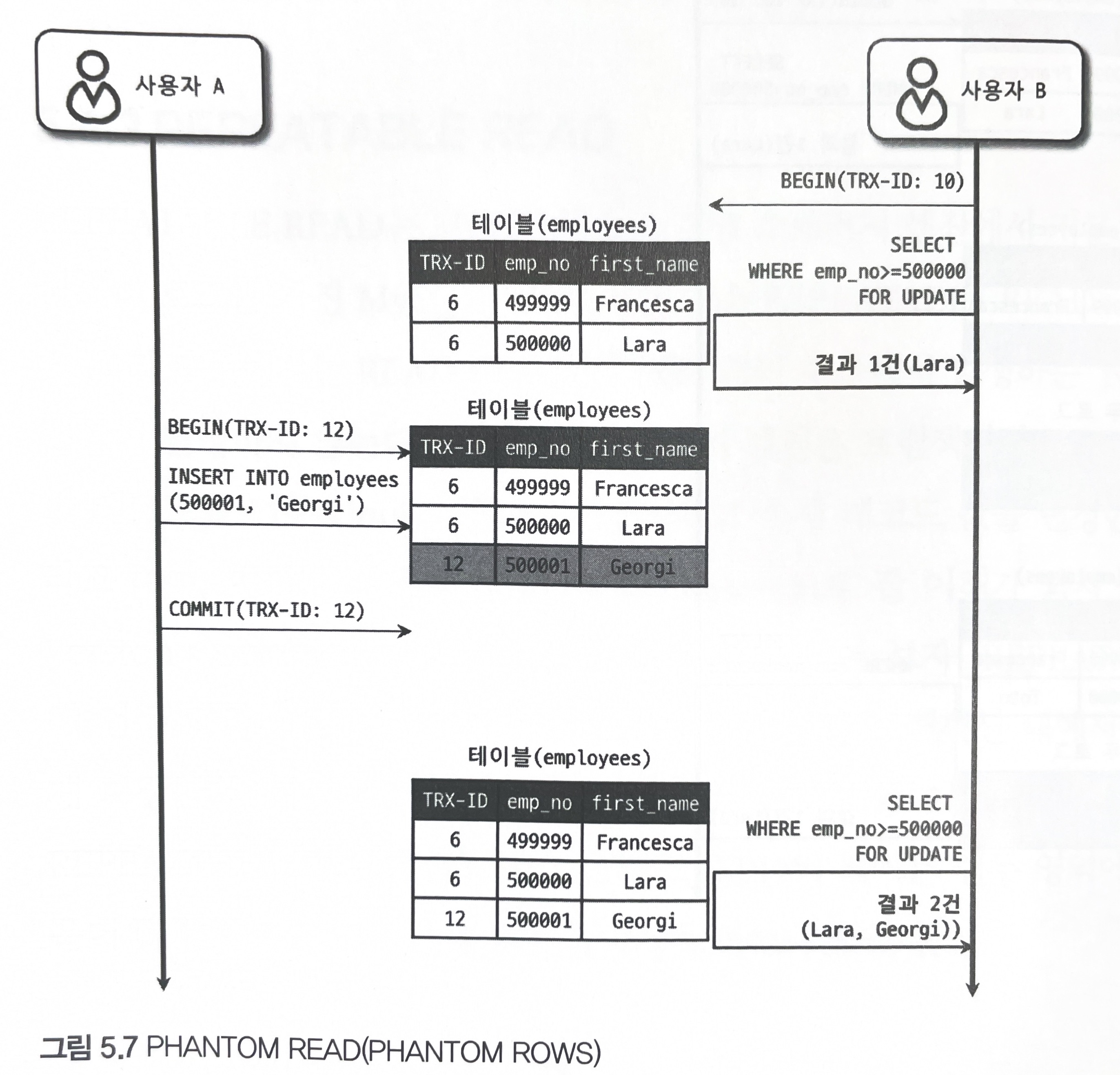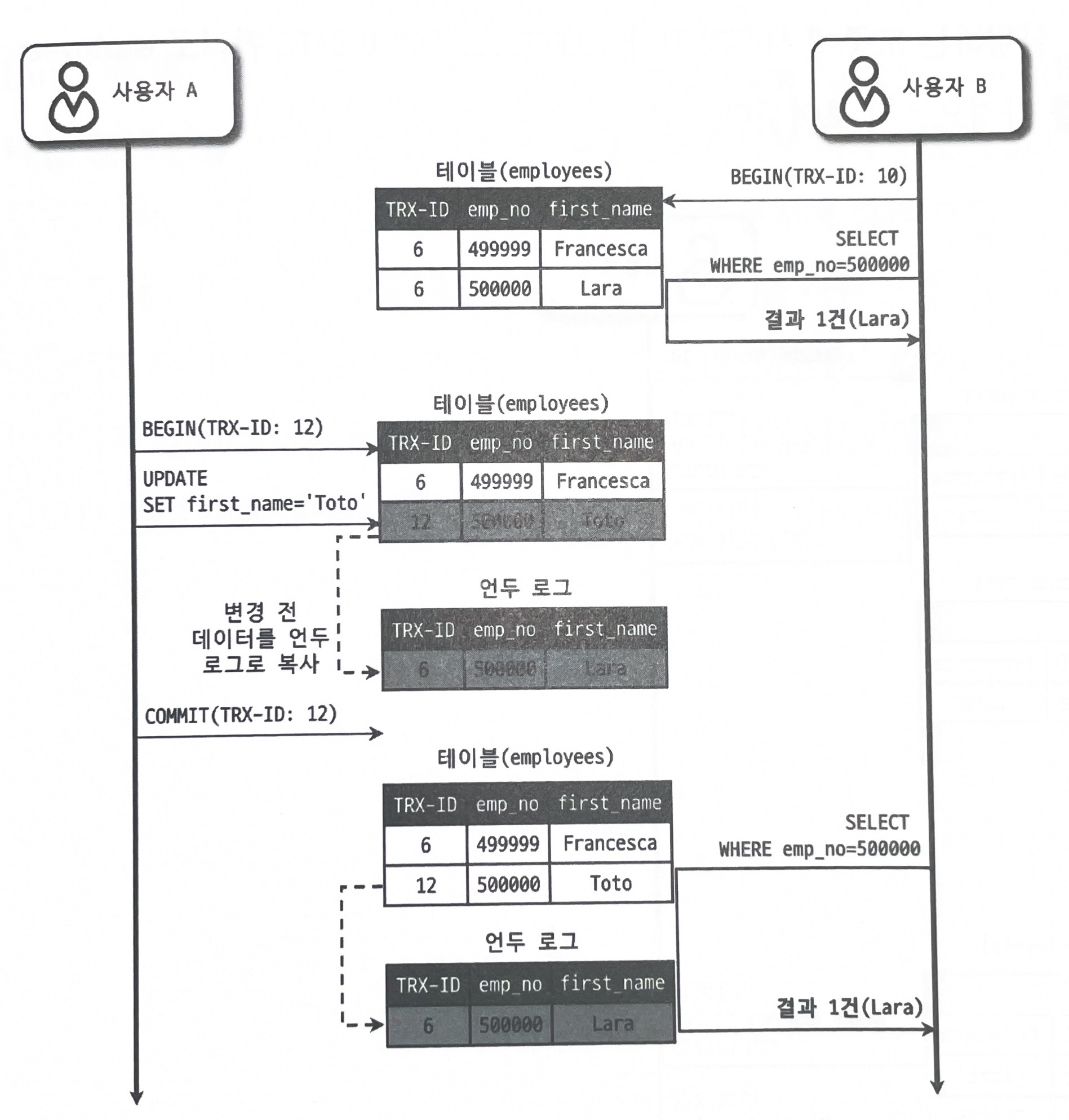 이 질문의 답은 MySQL 서버의 시스템 변수(transaction_isolation)에 설정된 격리 수준(Isolation level)에 따라 다르다는 것이다. 격리 수준이 READ_UNCOMMITED인 경우에는 InnoDB 버퍼 풀이 현재 가지고 있는 변경된 데이터를 읽어서 반환한다. 즉, 데이터가 커밋됐든 아니든 변경된 상태의 데이터를 반환한다. 그렇지 않고 READ_COMMITED나 그 이상의 격리 수준(REPEATABLE_READ, SERIALIZABLE)인 경우에는 아직 커밋되지 않았기 때문에 InnoDB 버퍼 풀이나 데이터 파일에 있는 내용 대신 변경되기 이전의 내용을 보관하고 있는 언두 영역의 데이터를 반환한다. 이러한 과정을 DBMS에서는 MVCC라고 표현한다. 즉, 하나의 레코드(회원 번호가 12인 레코드)에 대해 2개의 버전이 유지되고, 필요에 따라 데이터가 보여지는지 여러 가지 상황에 따라 달라지는 구조다. 여기서는 한 개의 데이터만 가지고 설명했지만 관리해야 하는 예전 버전의 데이터는 무한히 많아질 수 있다(트랜잭션이 길어지면 언두에서 관리하는 예전 데이터가 삭제되지 못하고 오랫동안 관리돼야 하며, 자연히 언두 영역이 저장되는 시스템 테이블스페이스의 공간이 많이 늘어나는 상황이 발생할 수도 있다).