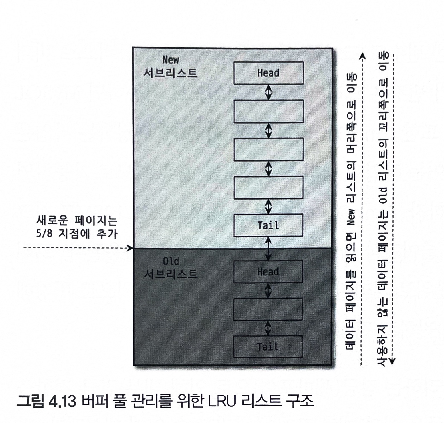 버퍼 풀의 페이지 크기 조각을 관리하기 위해 InnoDB 스토리지 엔진은 크게 LRU 리스트와 플러시 리스트, 그리고 프리 리스트라는 3 개의 자료 구조를 관리한다.