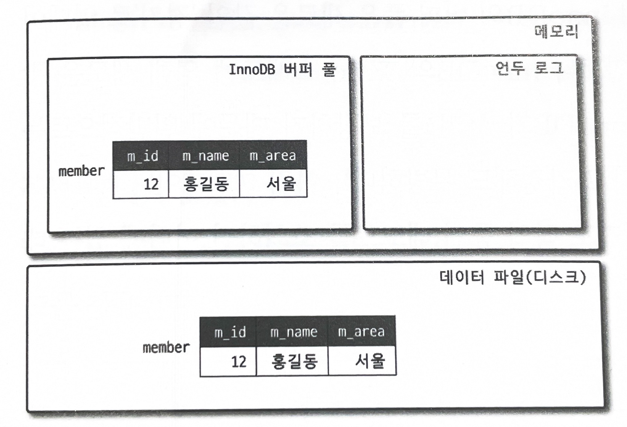 UPDATE 문장이 실행되면 커밋 실행 여부와 관계없이 InnoDB의 버퍼 풀은 새로운 값인 '경기'로 업데이트된다. 그리고 디스크의 데이터 파일에는 체크포인트나 InnoDB의 Write 스레드에 의해 새로운 값으로 업데이트돼 있을 수도 있고 아닐 수도 있다(InnoDB가 ACID를 보장하기 때문에 일반적으로 InnoDB의 버퍼 풀과 데이터 파일은 동일한 상태라고 가정해도 무방하다). 아직 COMMIT이나 ROLLBACK이 되지 않은 상태에서 다른 사용자가 다음 같은 쿼리로 작업 중인 레코드를 조회하면 어디에 있는 데이터를 조회할까?