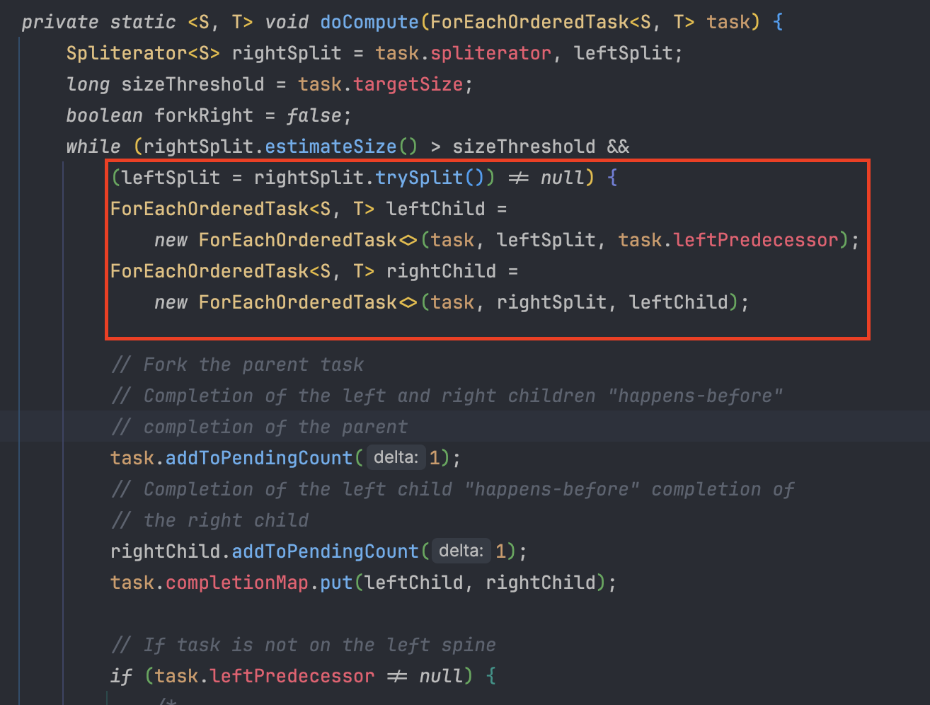 Stream 패키지의 ForEachOps 클래스에서 split 연산을 하는 부분을 찾아보면