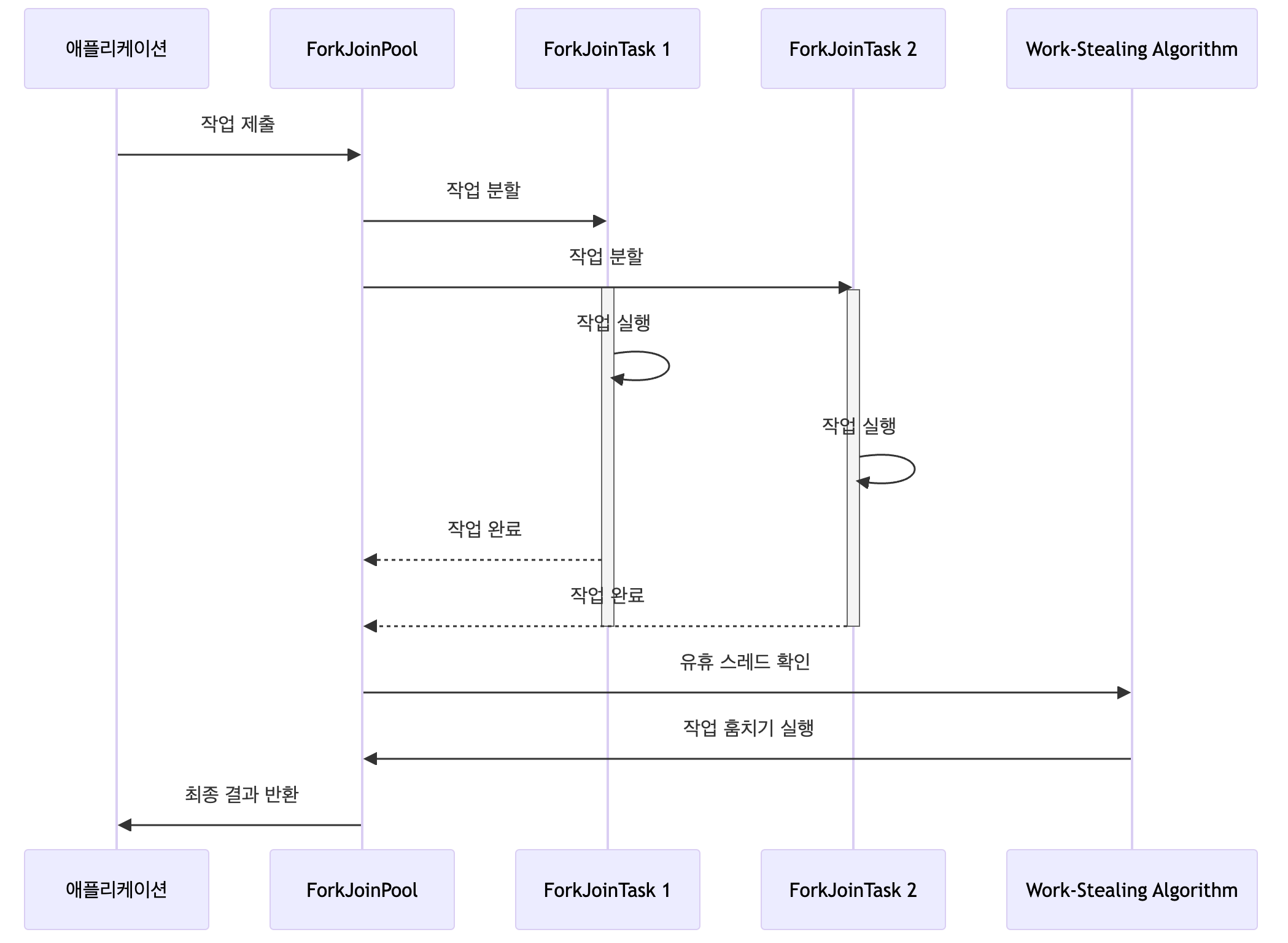 join()을 호출하고 대기 상태에 들어가면, ForkJoinPool은 다른 스레드가 유휴 상태에 빠지지 않도록 작업 훔치기 알고리즘을 활성화한다. 즉, 대기 중인 스레드가 다른 스레드의 작업 데큐(deque)에서 실행할 수 있는 태스크를 찾아 실행한다. - 결과 합병: 모든 서브 태스크의 실행이 완료되고, 그 결과가 준비되면,
