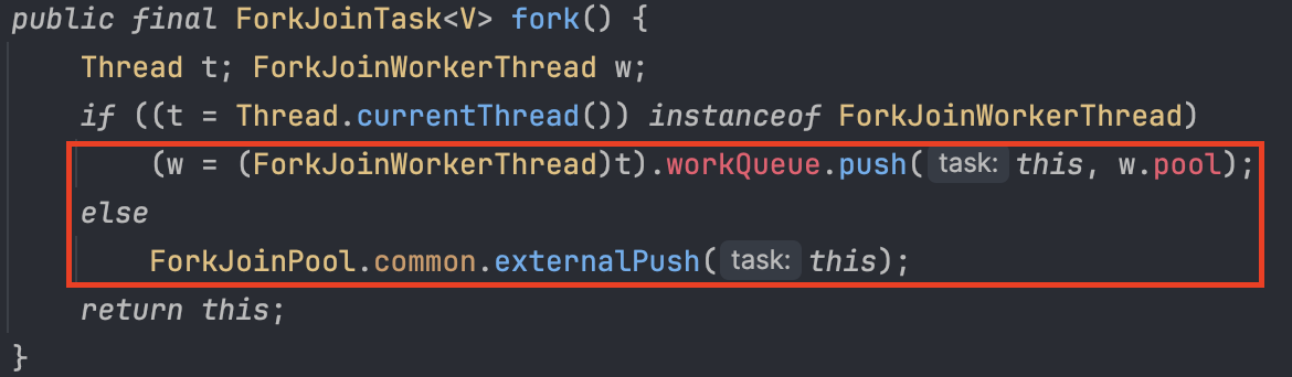 실제 구현을 보면 ForkJoinPool의 externalPush 메소드를 호출하여 실행되는 것을 볼 수 있는데,fork() 메소드는 ForkJoinTask를 현재 스레드의 작업 큐에 추가한다. 만약 현재 스레드가 ForkJoinWorkerThread의 인스턴스인 경우, 해당 스레드의 작업 큐(workQueue)에 직접 접근하여 작업을 추가하고, 그렇지 않은 경우에는 ForkJoinPool.common을 통해 공통 풀에 작업을 제출한다.