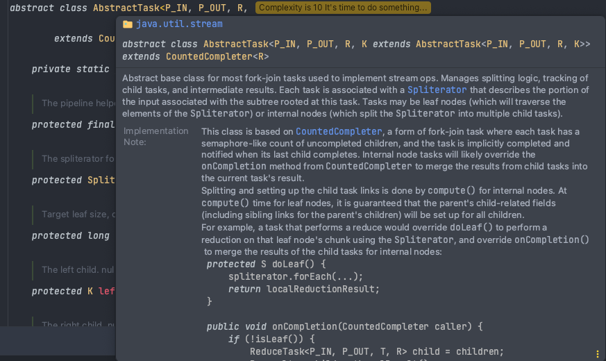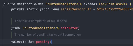 AbstractTask 는 내부적으로 match, foreach 등의 연산을 사용할 때 확장하는 abstract 클래스인데, CountedCompleter를 확장하는 클래스이기 때문에 java.concurrnet의 forkjoinpool에서 설정된 pool size를 사용한다. 그렇다면 CountedCompleter 는 무엇일까? CountedCompleter 를 보면 package java.util.concurrent; 에 존재하는 클래스로서 forkhjointask를 확장한 abstract 클래스임을 볼 수 있다.