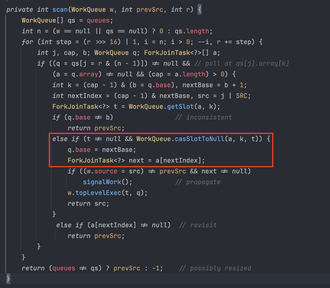 코드에서 WorkQueue[] qs = queues;는 모든 스레드의 작업 큐를 포함하는 배열이다. for 루프는 이 배열을 순회하며, 다른 스레드의 큐에서 실행 가능한 작업(ForkJoinTask<?> t = a[k];)을 찾는다. 작업을 성공적으로 "훔쳤다면"(즉, WorkQueue.casSlotToNull(a, k, t)가 true를 반환하면), 해당 작업의 인덱스(q.base)를 업데이트하고 작업을 실행한다. 여기서 cas 연산으로 안전하게 slot을 Null로 변환하는 것을 Stealing으로 처리하는 것으로 볼 수 있다.