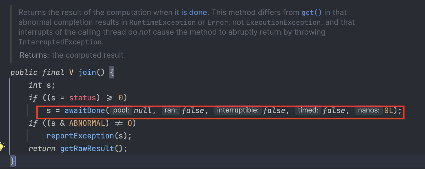 join()은 내부에 awaitDone() 메서드를 통해 작업이 완료될 때까지 현재 스레드를 대기 상태로 만든다. 해당 메서드는 내부 로직이 복잡한데, 중요한 부분만 한 번 살펴보자.