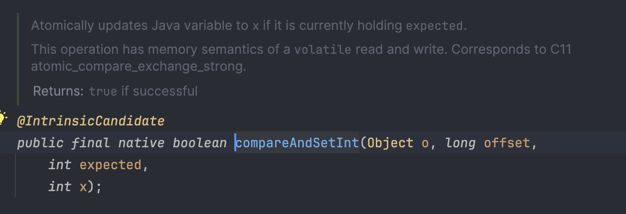 설명에 따르면 이 메서드의 원자적 연산의 보장은 'volatile' 읽기 및 쓰기의 메모리 의미를 가지며, C11의 atomic_compare_exchange_strong에 해당하는 동작을 함으로써 이루어진다. 원자적 연산의 특성상 하드웨어 수준에서의 제어와 함께 구현된다고 볼 수 있겠다.