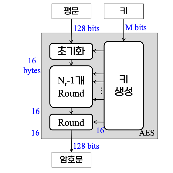 - 키 길이: 128 bits, 192 bits, 256 bits 중 택일