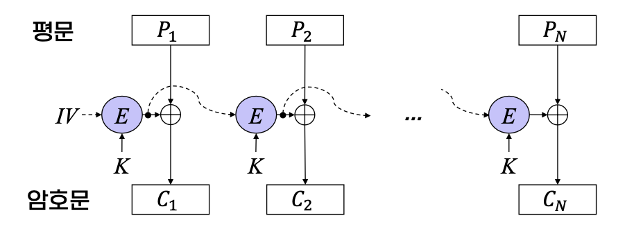 - 초깃값 IV를 암호화한 값과 평문 블록을 XOR하여 암호문 블록을 생성하고, 그 암호문을 초깃값으로 하여 다시 암호화한 값과 평문 블록을 XOR 하여 암호문 블록을 반복하여 생성하는 방식