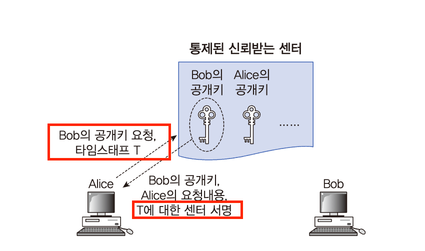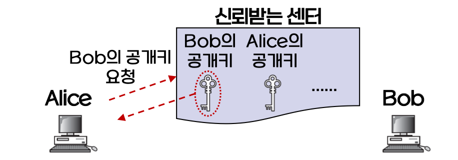 일단 신뢰받는 센터에 올라온 공개키라면, 센터는 디렉터리를 안전하게 관리할 것이다. 이때 공격자가 다른 사람의 공개키로 바꾸지 못하도록 공개키를 등록하려는 사람은 본인의 신분을 증명ㅅ하고서 자신의 공개키를 디렉터리에 올릴 수 있어야 한다.
