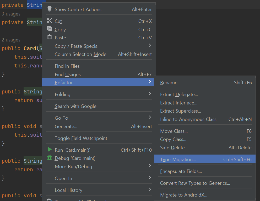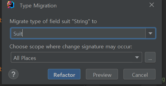이때 이전의 class에서 정의한 crad class를 to use this enum 리팩토링 => type migration