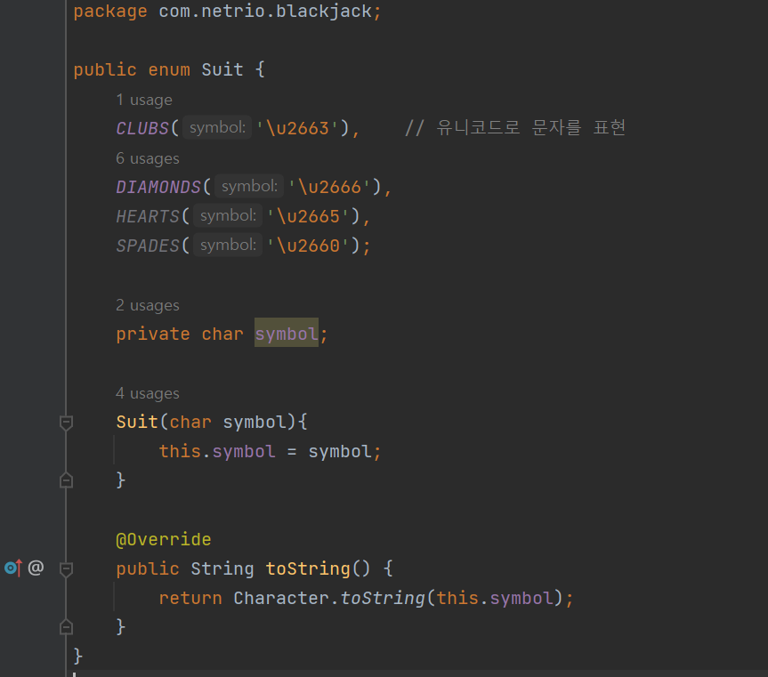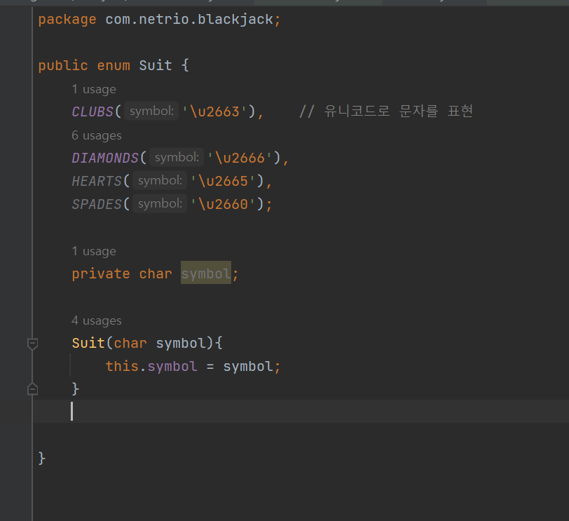 CLUBS('\u2663'), // ?��?��코드�? 문자�? ?��?��