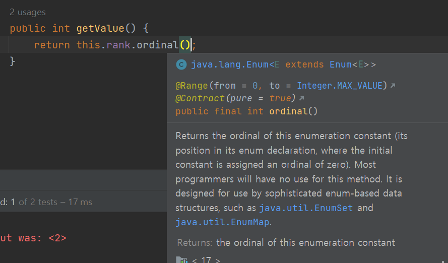 Enum actually have a few methods and properties inherent in them. one of the mthods that is available is a method called ordinal.