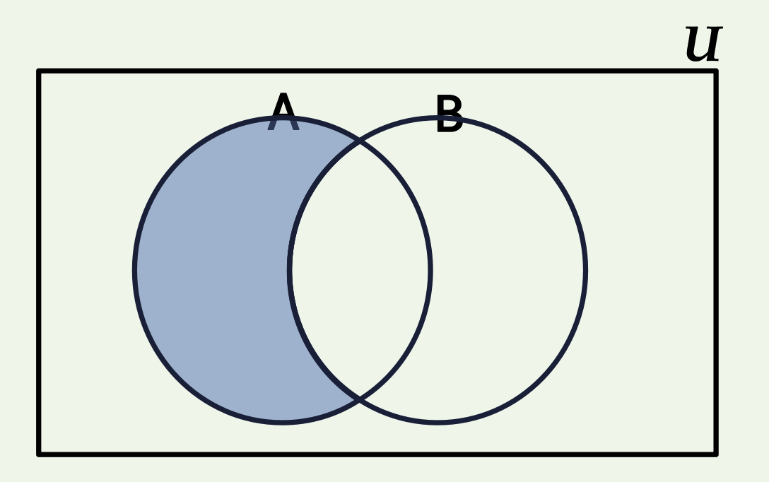 𝑨 − 𝑩 = {𝒙 ∈ 𝑼 | 𝒙 ∈ 𝑨 ∧ 𝒙 ∉ 𝑩}