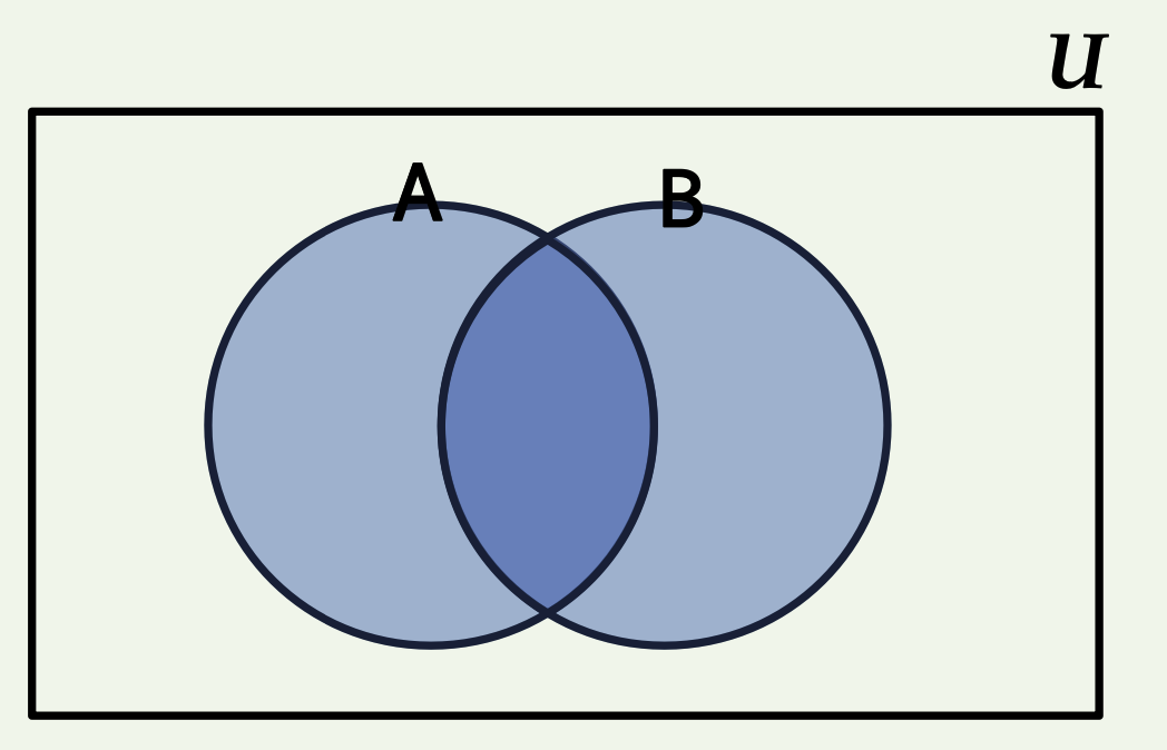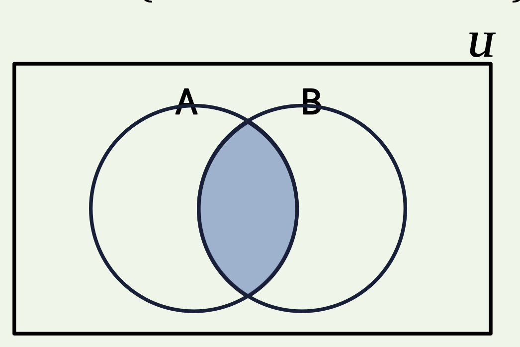 𝑨 ∩ 𝑩 = {𝒙 ∈ 𝑼 | 𝒙 ∈ 𝑨 ∧ 𝒙 ∈ 𝑩}