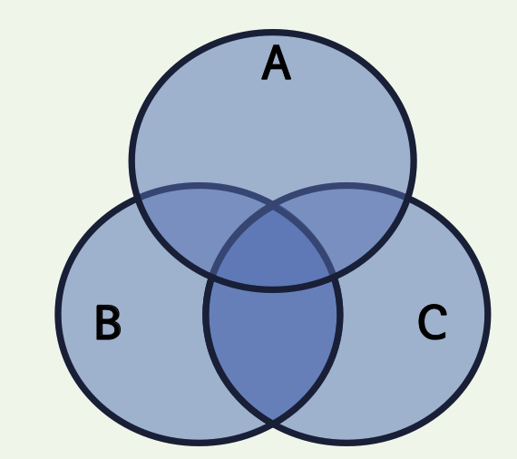 집합 A, B, C가 유한집합이면 |𝑨 ∪ 𝑩 ∪ 𝑪 | = | 𝑨 | + | 𝑩 | + | 𝑪 | − | 𝑨∩𝑩 | − | 𝑨∩𝑪 | − | 𝑩∩𝑪 | + | 𝑨∩𝑩∩𝑪 |