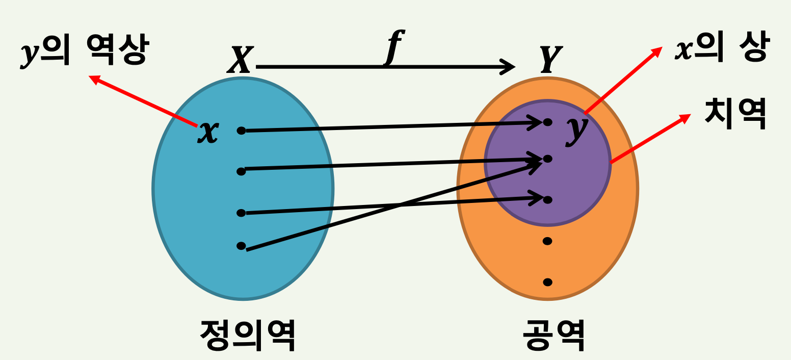 집합 \(X\)와 \(Y\)가 주어졌을 때, \(X\)에서 \(Y\)로의 함수 \(f\)는 다음 조건을 만족하는 관계이다.