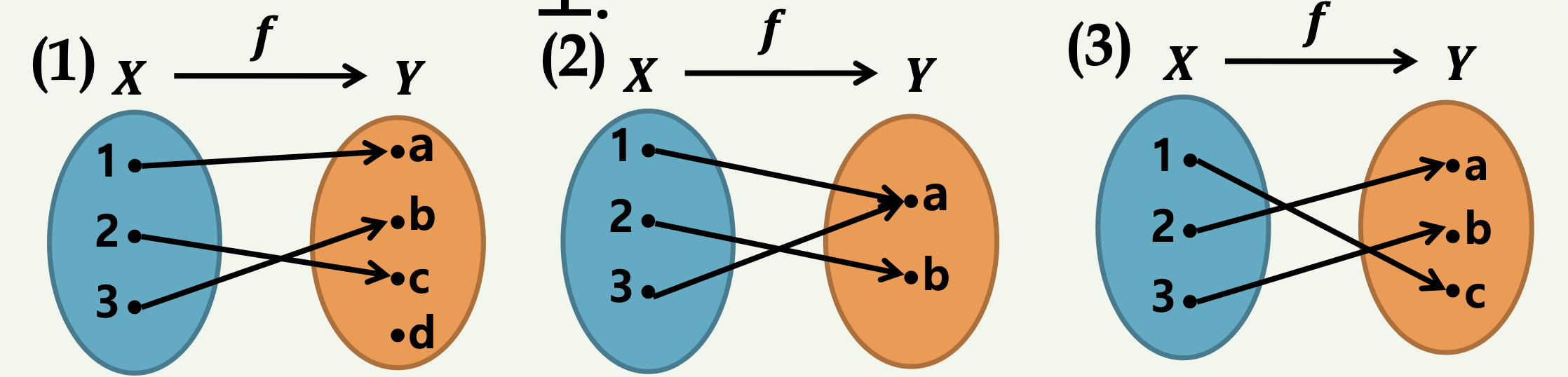 - 함수 \( f : X \rightarrow Y \)에서 \( X = \{1, 2, 3\} \)와 \( Y = \{a, b, c, d\} \)이다.