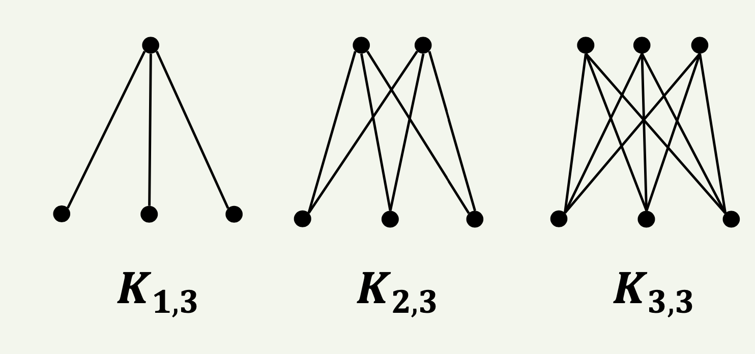 그래프 \( G = (V, E) \)에서 이분 그래프는 두 개의 분리된 정점 집합 \( V_1 \)과 \( V_2 \)로 이루어져 있다. 즉, \( V_1 \cap V_2 = \emptyset \)이며, \( V_1 \cup V_2 = V \)이다. 이때 모든 \( v_1 \in V_1 \)와 \( v_2 \in V_2 \)에 대해 항상 \( (v_1, v_2) \in E \)인 간선이 존재하면, 이 그래프 \( G \)를 완전 이분 그래프(complete bipartite graph)라 한다. 이를 수식으로 표현하면 다음과 같다.