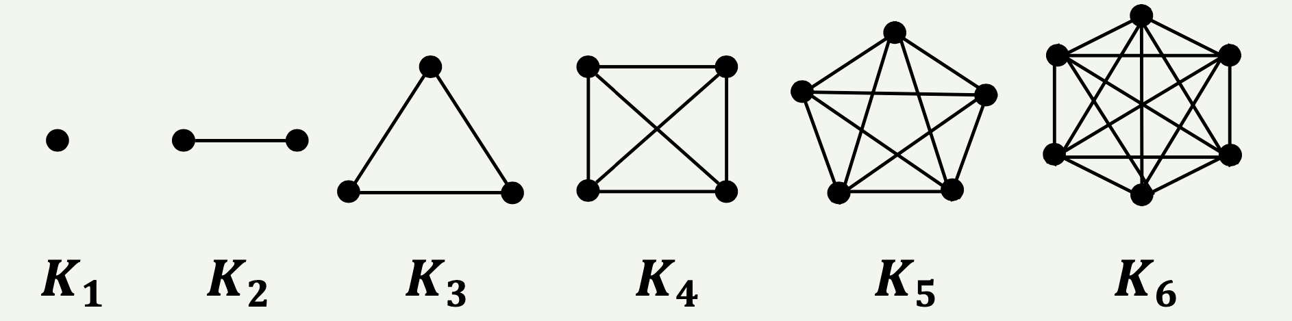 완전 그래프는 \(K_n\)으로 나타내며, 여기서 \(V = n\)인 완전 그래프를 의미한다.
