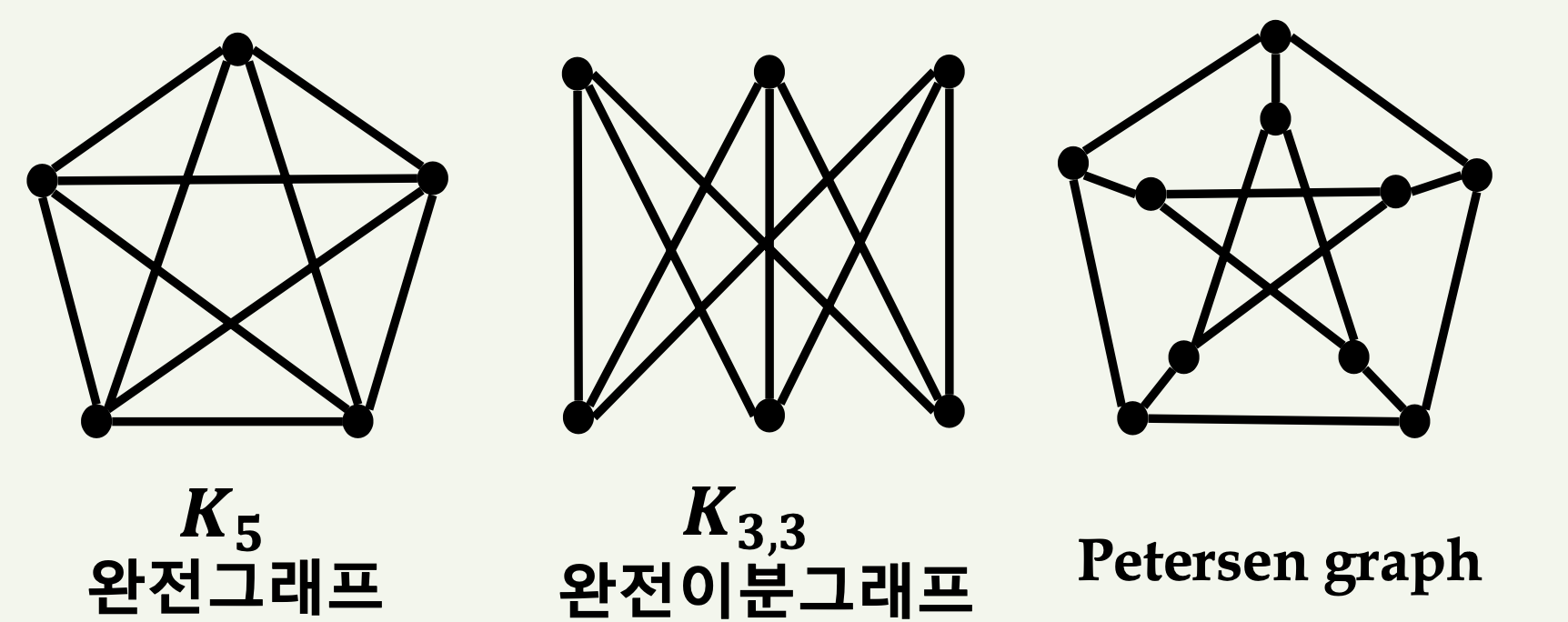 그래프 \( G \)는 \( K_5 \)나 \( K_{3,3} \)의 서브그래프를 포함하지 않을 때 평면 그래프가 된다.