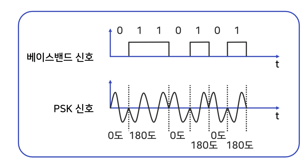 - PSK는 0과 1의 두 가지 비트 상태를 표현하기 위해 반송파 신호의 위상을 변화시킨다.