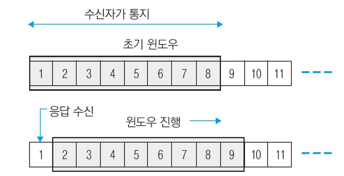 - 그림에서 1번 패킷에 대한 ACK를 수신한 후 윈도우가 이동하여 2번부터 9번 패킷을 포함하게 된다.