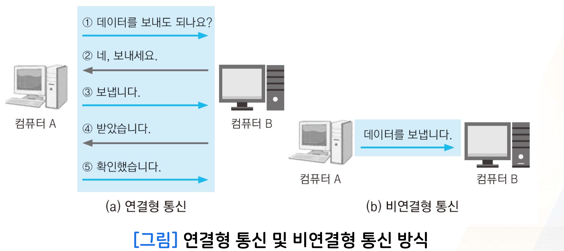 전송 계층은 데이터를 수신지까지 문제없이(신뢰성) 빠르고 정확하게 효율적으로 전송해야 한다. 신뢰할 수 있고 데이터를 정확하게 전달하는 통신 방식은 연결형 통신이다. 반면 효율적으로 데이터를 전송하는 통신 방식은 비연결형 통신이다. 연결형 통신은 서로 확인하고 요청과 응답을 주고받으면서 통신하고, 비연결형 통신은 일방적으로 데이터를 전송한다. 비연결형 통신에는 UDP 프로토콜이 사용되고, 연결형 통신에는 TCP 프로토콜이 사용된다.