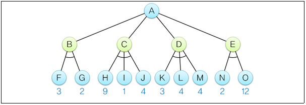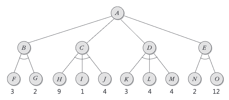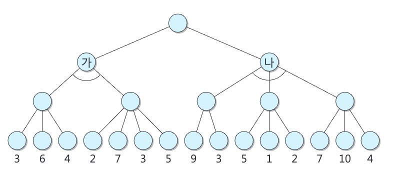 A와 B는 루트 노드의 자식 노드로 최소화 노드이다. 각 최소화 노드의 자식 노드들 중 최소 값을 선택한다.