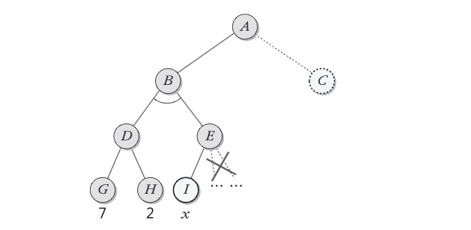 노드 \(B\)에서 후계노드 \(D\)의 가치를 계산한 결과는 7이며, 최소가치 후계노드를 선택하는 \(B\)에서는 앞으로 가치를 구하려는 후계노드의 가치는 7보다 더 작은 것만 의미가 있다. 그러므로 \(D\)의 가치를 구한 후 \(B\)의 \(\beta\)는 7이 된다. \(B\)의 후계노드 \(E\)는 \(\beta\)보다 더 작은 가치를 가져야만 그 최소화 노드의 가치가 될 수 있다. 만일 최대화 노드인 \(E\)의 후계노드 중 어느 하나라도 \(\beta\)보다 큰 값을 갖는 것이 있다면 \(E\)는 \(B\)에서 선택될 가능성이 없으므로 \(E\)의 나머지 후계노드들은 가지치기한다(최대화 노드에서 어느 한 후계노드의 가치가 \(v\)일 때 \(\beta \leq v\)라면 그 최소화 노드의 나머지 후계노드들은 가지치기함).