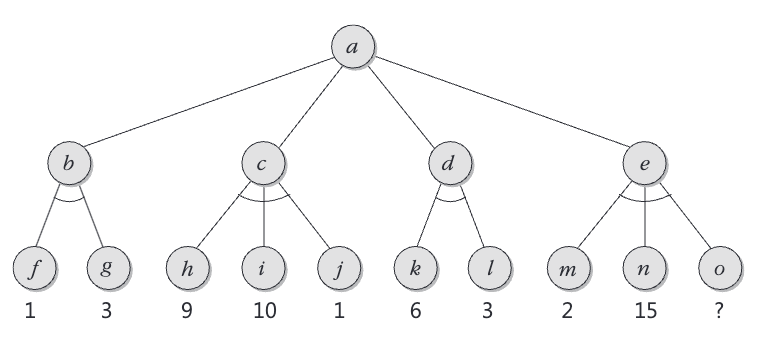 최소화 단계의 노드인 \( b, c, d, e \)의 가치는 자식노드 가치의 최소값을 택한다. 따라서 노드 \( b \)와 \( c \)의 가치는 1, 노드 \( d \)의 가치는 3이다. \( e \)의 가치는 \( m, n, o \)의 가치의 최소값이다. 아직 노드 \( o \)의 값은 결정하지 않았지만, \( e \)의 가치는 \( m \)의 가치인 2보다 클 수 없다. 노드 \( a \)에서는 가치가 최대인 자식노드를 선택하여 수를 둔다. 따라서 노드 \( d \)가 선택된다.