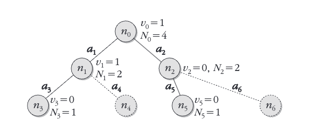① 선택(selection): 루트노드에서 시작하여 선택전략에 따라 자식노드를 선택하는 과정을 깊이방향으로 반복한다. 이 선택과정은 아직 시도해 보지 않은 행동이 남아 있는 노드에 도달할 때까지 반복한다.