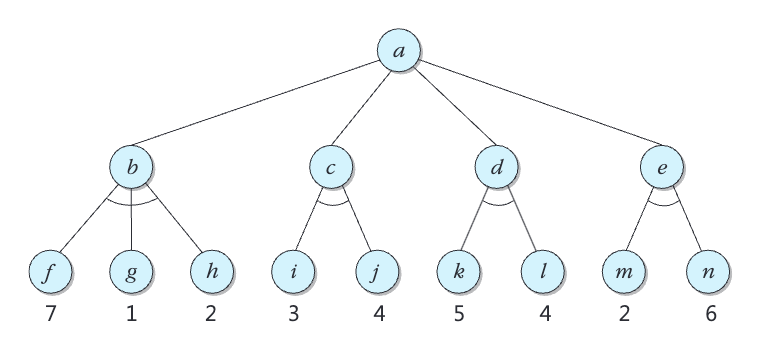 2. 게임을 위한 최대최소 탐색트리가 다음과 같다고 하자. 리프노드에는 각 노드에서 평가한 리프노드의 가치가 표시되어 있다. \(a\) 상태에서 다음 수를 선택하는 과정에 대하여 설명하라.