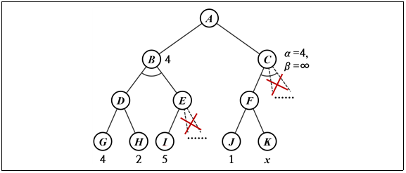 해설: α-β 가지치기는 최대최소 탐색트리에서 불필요한 가지를 잘라냄으로써 탐색의 성능을 높이기 위한 알고리즘이다. 최소화 노드에서 한 후계노드의 가치가 v일 때 α≥v라면 그 최소화 노드의 나머지 후계노드들은 가지치기한다. 또한 최대화 노드에서 한 후계노드의 가치가 v일 때 β≤v라면 그 최대화 노드의 나머지 후계노드들은 가지치기한다.