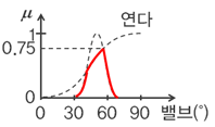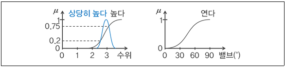 3. “IF (수위가 높다) THEN (밸브를 연다)”라는 퍼지 규칙이 있다. 제어 대상으로부터 관측된 사실이 “수위가 상당히 높다”이며, 이에 대한 소속함수가 다음 그림과 같을 때, 이 규칙을 적용한 결과 얻는 결론의 소속함수는?