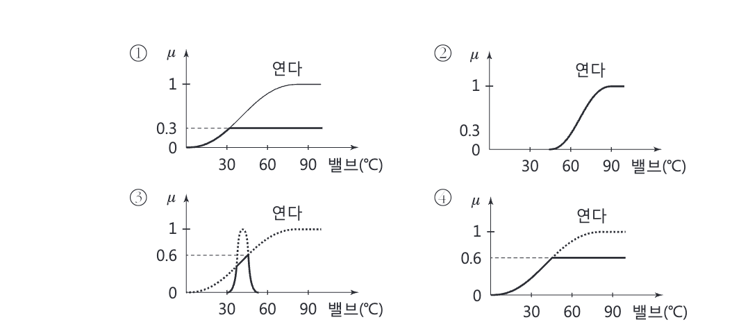해설 : X∪Y는 X와 Y의 소속함수의 최댓값으로 각 원소의 소속함수 값이 정해지며, X∩Y는 X와 Y의 소속함수의 최솟값으로 각 원소의 소속함수 값이 정해진다. ③에서 집합 Y에 대해 a의 소속함수는 0이므로 X∩Y에서 a의 소속함수 값은 0이다. 여집합은 전체집합에 대해 구한다. 이 문제에서 전체집합이 명시되지는 않았지만, Y에 (e, 1.0)이 있는 것으로 유추하였을 때 XC에는 최소한 (e, 1.0)이 포함되어 있어야 함을 알 수 있다. 또한 Y에서 a의 소속함수가 0.0이므로 YC에서 a의 소속함수는 1.0이 되어야 한다.