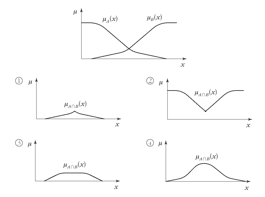 5. 퍼지집합 \( A \)와 \( B \)의 소속함수가 다음과 같을 때 \( A \cap B \)의 소속함수는?