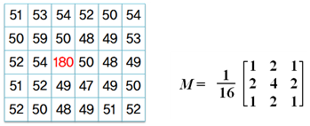 2. 픽셀 값들이 다음 그림과 같을 때 가우시안 저역통과 필터마스크 M을 적용하면 현재 180이 저장되어 있는 픽셀의 값이 어떠한 값이 되는가?