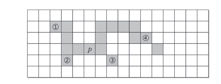 7. 4-이웃 연결성을 사용할 경우 픽셀 \( p \)로부터 연결되는 경로가 존재하는 픽셀이 아닌 것은?