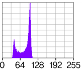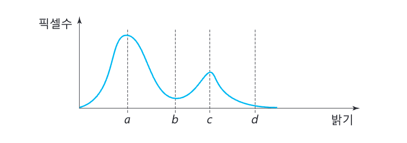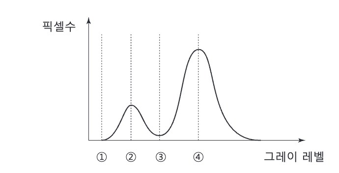 해설: 균일한 배경에 해당되는 히스토그램 영역과 균일한 밝기의 물체에 해당되는 히스토그램 영역에 2개의 피크를 갖는 히스토그램이다. 이 경우 두 피크 사이의 최저점에 해당되는 곳을 임계치로 정할 수 있다.