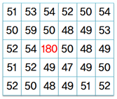 3. 픽셀 값들이 다음 그림과 같을 때 3×3 크기의 중간값 필터를 적용하면 현재 180이 저장되어 있는 픽셀의 값이 어떠한 값이 되는가?