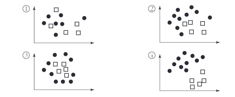 4. 다음의 패턴분포 중 단층 퍼셉트론으로 학습할 수 있는 것은?