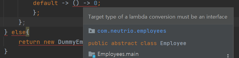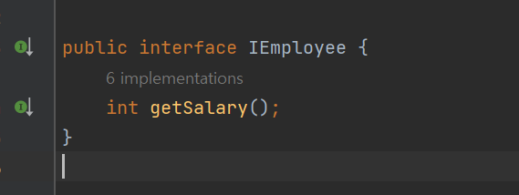 여기서 일어나는 로직은 this functions appears and Java sees this expression, which is decribing a method that takes no input and returns an integer, it sees that the return type as IEmployee and goes look at the code and find same expression => create an object that implements the IEmployee => return what is declared.