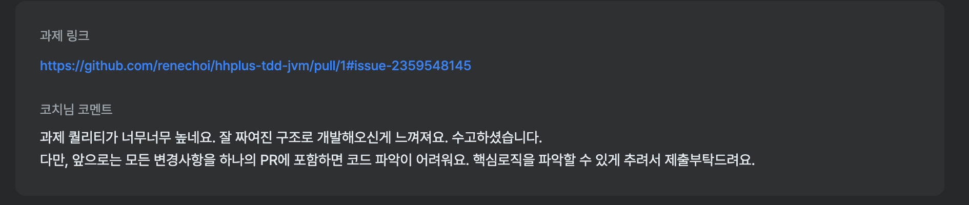 처음 제출한 과제에서 과분한 칭찬을 받았다. 사실 이런 칭찬을 받으면 짜릿하다. 😇