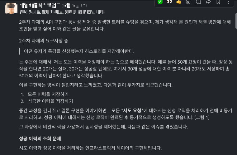 각 주차를 통과하면서 많은 궁금증을 가졌다. 다양한 채널을 통해 코치님들 및 동료 개발자들과 질문을 주고받을 수 있었다.